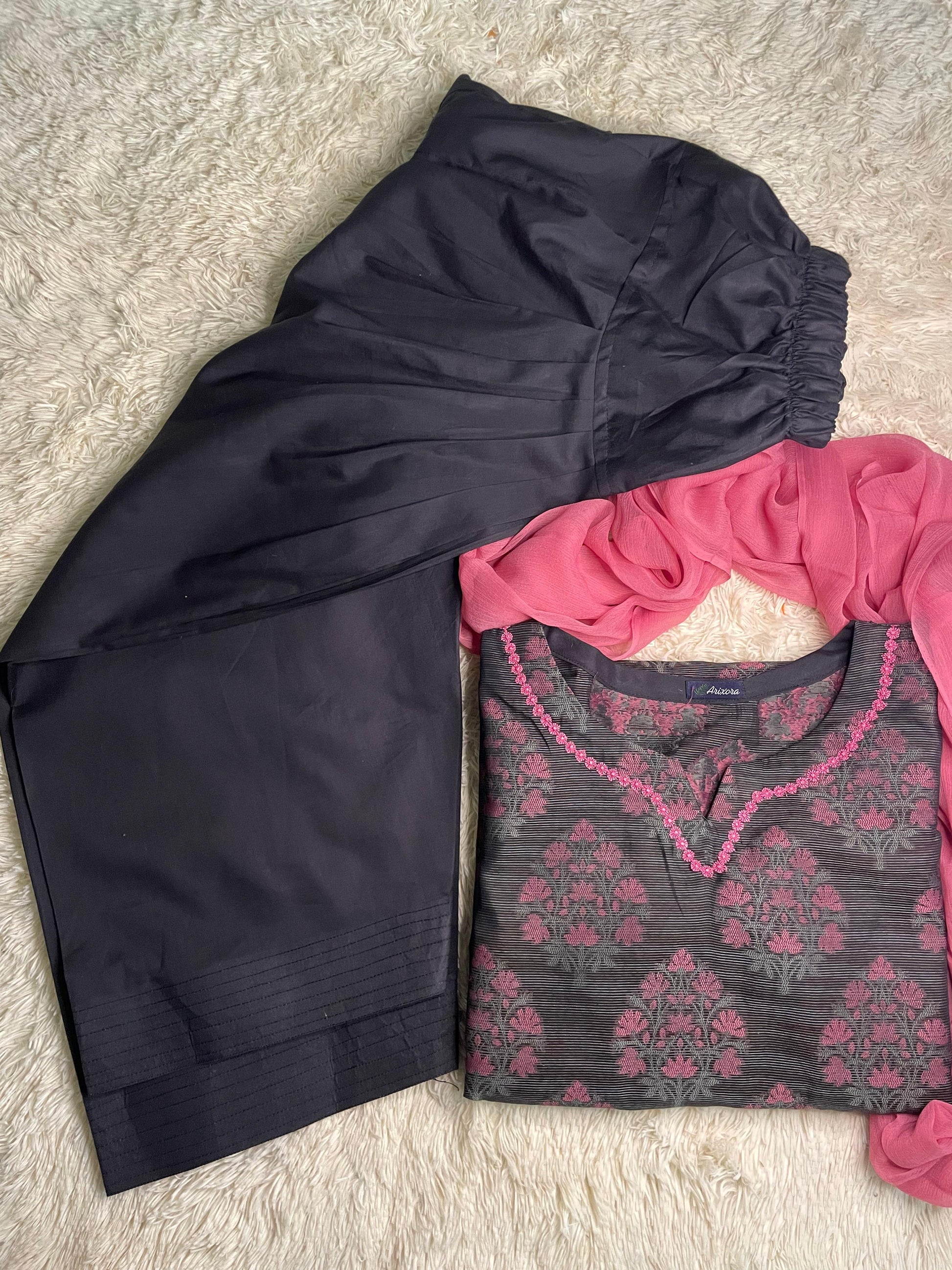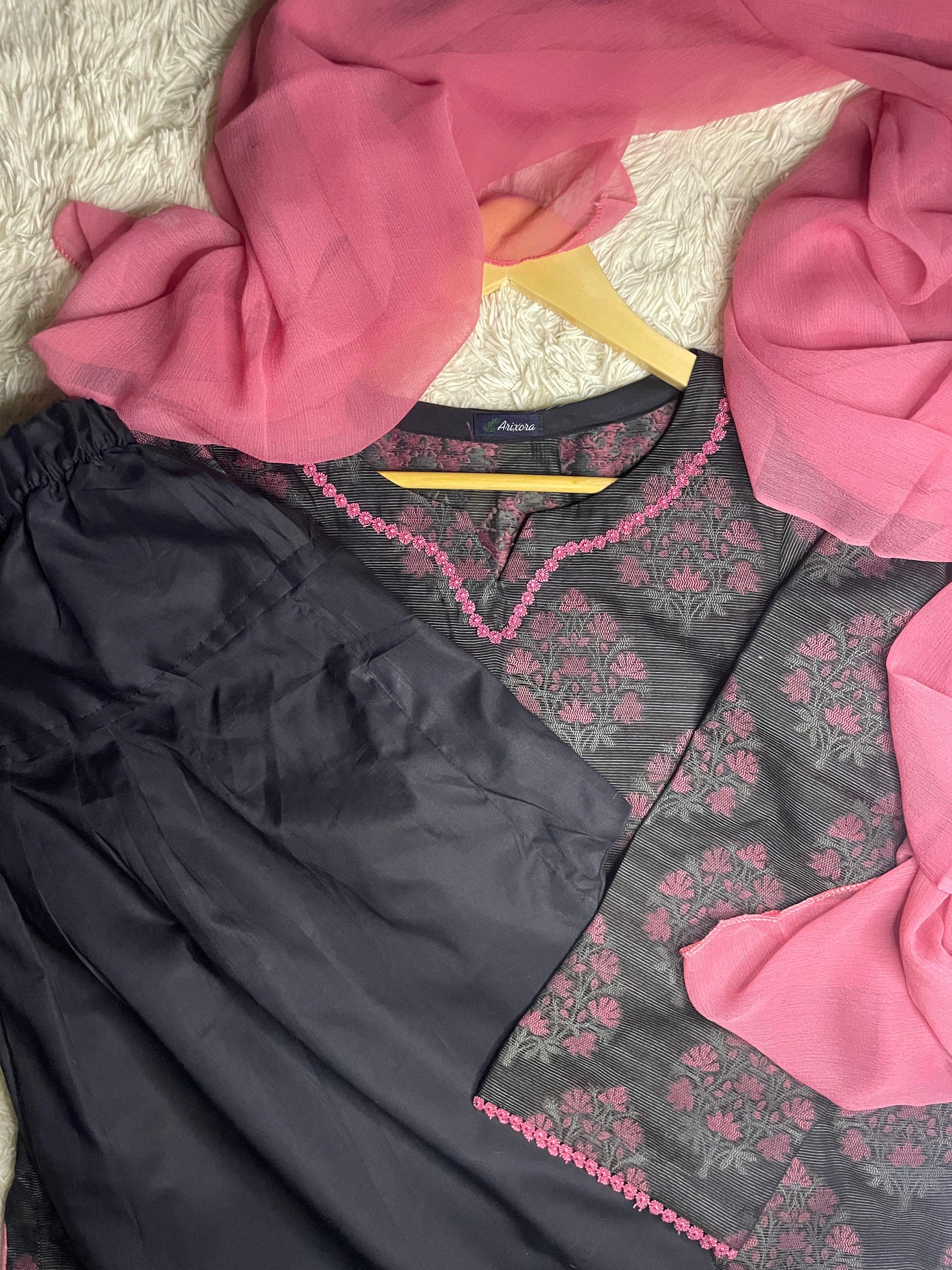 ---Arixora’s Solid Embroidered Stitched Three-Piece Suit features a beautifully textured fabric enhanced with delicate hand embroidery. Expertly tailored for a flawless ready-to-wear fit, this elegant ensemble includes a matching dupatta to complete the look. Designed with a graceful drape and refined structure, it reflects sophistication and timeless charm.